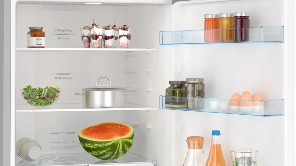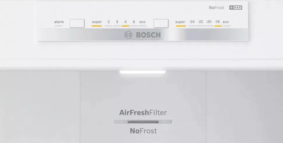 Сердце холодильника Bosch KGN55VL21U — это многофункциональная зона свежести. Большой изолированный ящик представляет собой влажную зону VitaFresh, специально предназначенную для фруктов, овощей и зелени. Пользователь может установить один из двух уровней влажности, создавая оптимальный микроклимат для сохранения витаминов, сочности и хрустящей текстуры продуктов на несколько дней дольше. Это, в сочетании с мощной многопоточной системой охлаждения и системой No Frost в обеих камерах, гарантирует равномерную температуру без образования инея, предотвращает смешивание запахов и обеспечивает идеальные условия для всех категорий продуктов.