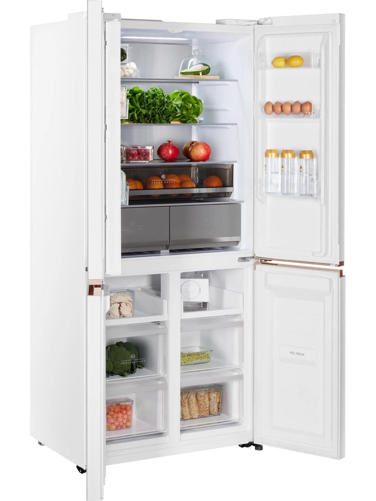 Инверторный холодильник HIBERG i-RFQ 630G WS – изысканный представитель бренда. Эффектный фасад из закаленного стекла в белом цвете с эффектом мрамора станет украшением любого кухонного и столового интерьера. Усовершенствованная конструкция отдельно стоящей модели и глубина 60 см позволят при необходимости гармонично интегрировать холодильник в мебельный гарнитур: достаточно всего 3 мм свободного пространства по бокам. А угол открытия двери в 90 градусов не препятствует полному выдвижению ящиков.