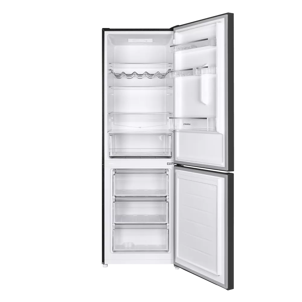 Двухкамерная конструкция с верхней холодильной (213 л) и нижней морозильной (104 л) камерами обеспечивает продуманную организацию хранения. В холодильном отделении предусмотрены стеклянные полки с металлической окантовкой, большая корзина для фруктов и овощей, боковые полки на дверце, решетка для бутылок и лотки для яиц. Низкий уровень шума 39 дБ делает MAUNFELD MFF185SFSB комфортным для кухни-гостиной.