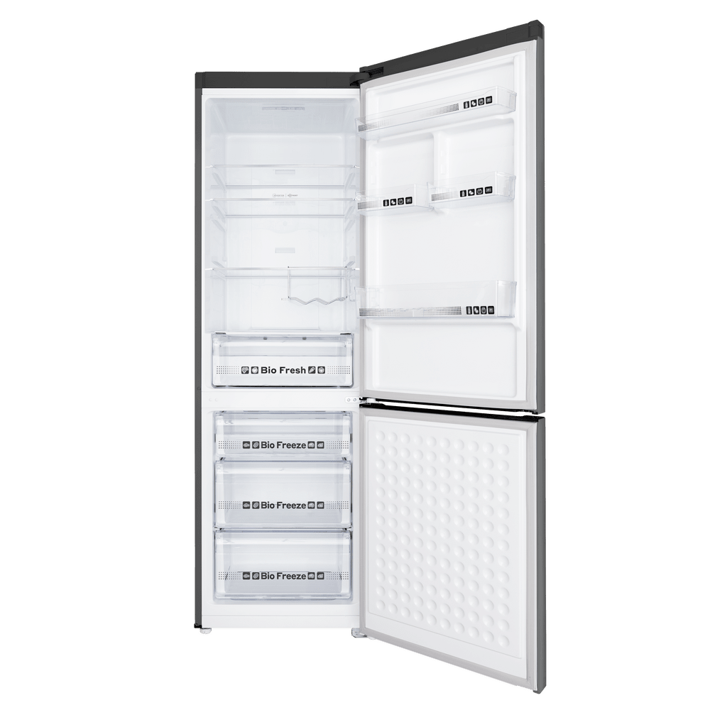 Верхняя холодильная камера объёмом 252 л продуманно разделена: стеклянные полки, большой ящик для фруктов и овощей, боковые полки на дверце и решётка для бутылок помогают поддерживать порядок. Морозильная камера на 98 л со стеклянной полкой и выдвижными ящиками ускоряет доступ к замороженным продуктам. Возможность перенавешивания двери добавляет гибкости при установке.