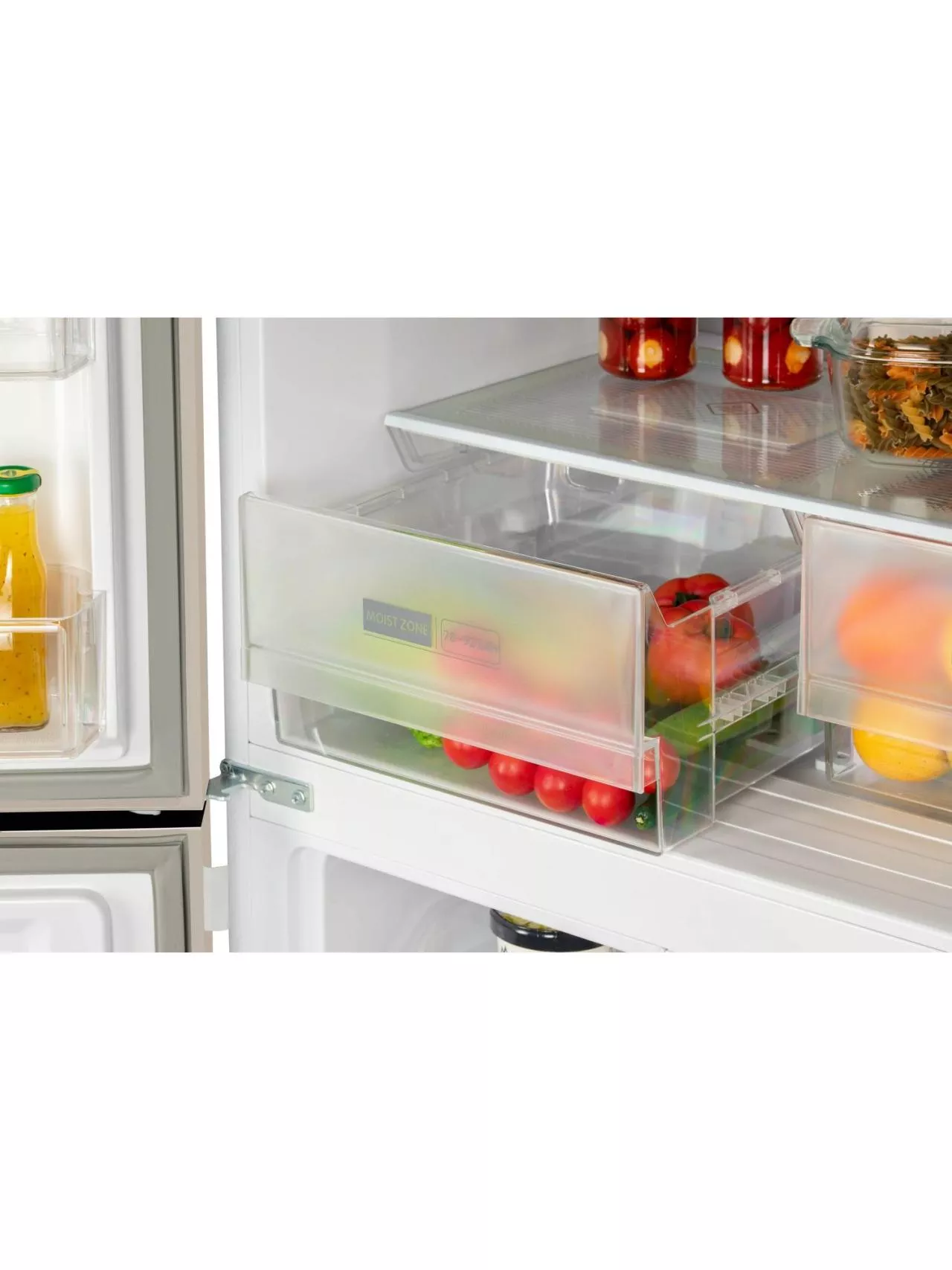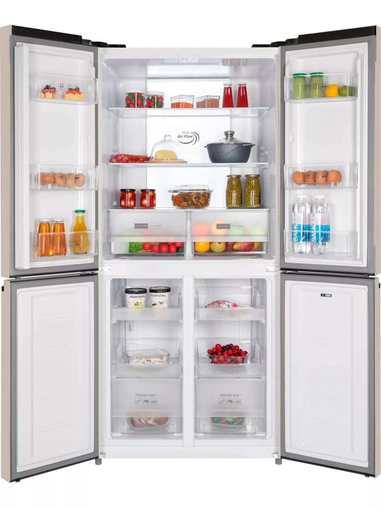 4-х дверный холодильник имеет единое пространство верхних полок холодильной камеры, чтобы удобно было размещать габаритные кастрюли и контейнеры. Прочные полки из закаленного стекла можно регулировать по высоте, а ящики в холодильной камере предназначены для хранения овощей и фруктов и оснащены влажной зоной свежести и сухой.