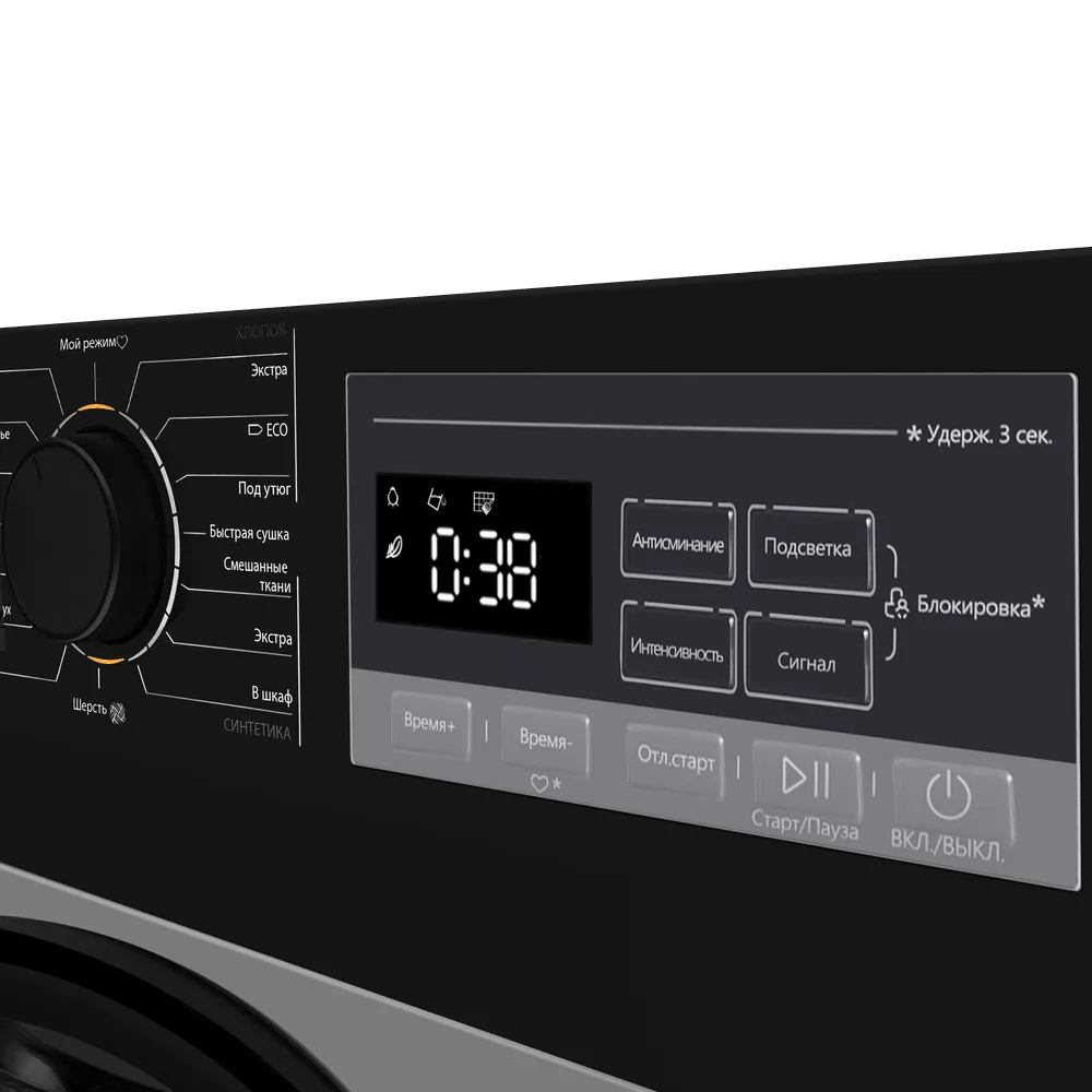 Комфорт в использовании дополняют продуманные детали: уровень шума 66 дБ делает работу тихой, режим «Антисмятие» облегчает последующий уход за одеждой, внутренняя подсветка улучшает обзор барабана, а блокировка от детей обеспечивает дополнительную безопасность.
