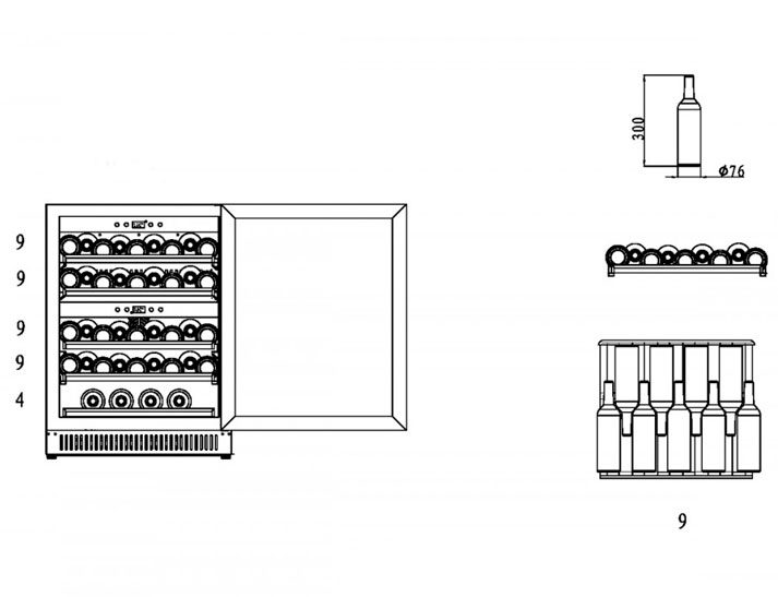 Пять съемных полок из дерева предназначены для правильного хранения вина: бутылки кладутся горизонтально (вместительность – 40 бутылок). Деревянные полки оборудованы фиксаторами от самопроизвольного выдвижения и компенсируют механические воздействия компрессора и вентилятора. Параметры холодильника задаются вручную, а также при помощи мобильного приложения «CASO-App». Возможна удаленная смена настроек из любой точки мира. Управление осуществляется при помощи двух сенсорных панелей. Регулировка температурных показателей с шагом в 1°C происходит нажатием « ∧ » и «∨». Управление внутренним освещением возможно при помощи кнопки «Свет». Встроенные светодиоды не нагреваются, и внутренний микроклимат остается максимально благоприятным для хранения бутылок.